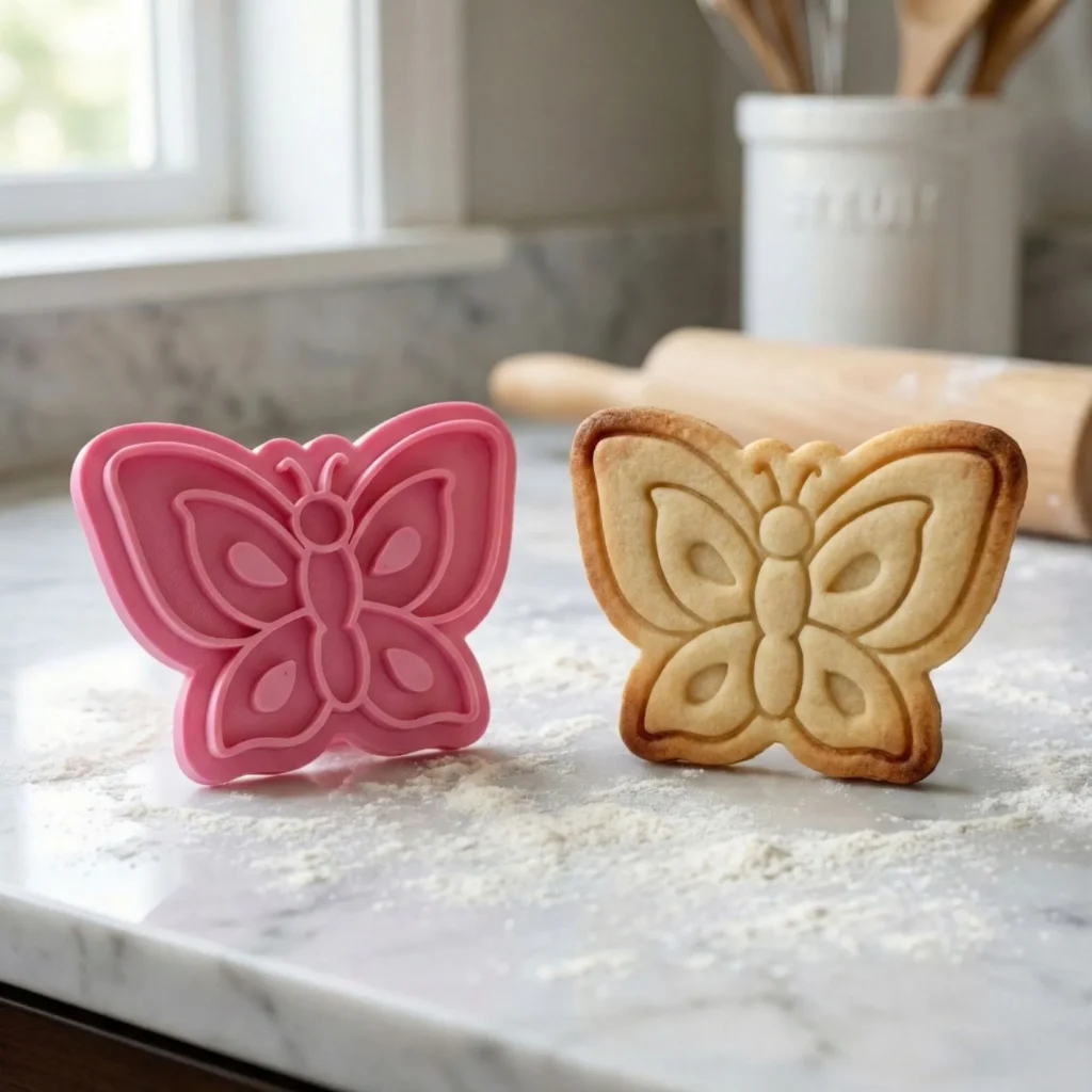Kit Cortador + Carimbo com pegador traseiro para facilitar o uso. Produzido em PLA biodegradável com acabamento premium para cortes precisos. Perfeito para biscoitos, pasta americana, massinha e artesanato.