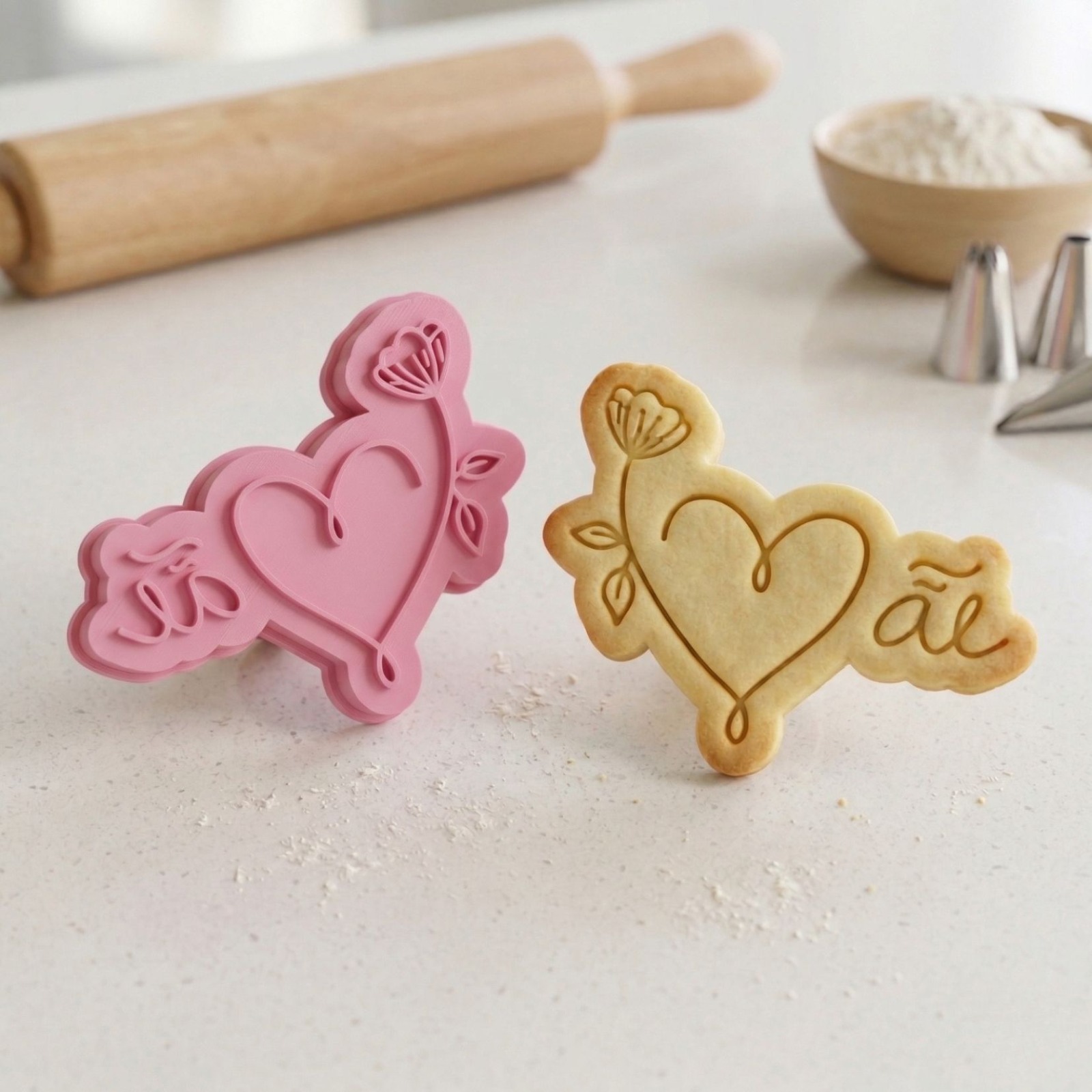 Kit Cortador + Carimbo com pegador traseiro para facilitar o uso. Produzido em PLA biodegradável com acabamento premium para cortes precisos. Perfeito para biscoitos, pasta americana, massinha e artesanato.