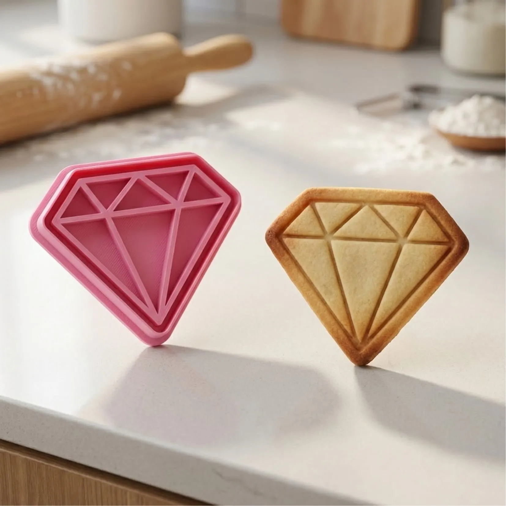 Kit Cortador + Carimbo com pegador traseiro para facilitar o uso. Produzido em PLA biodegradável com acabamento premium para cortes precisos. Perfeito para biscoitos, pasta americana, massinha e artesanato.