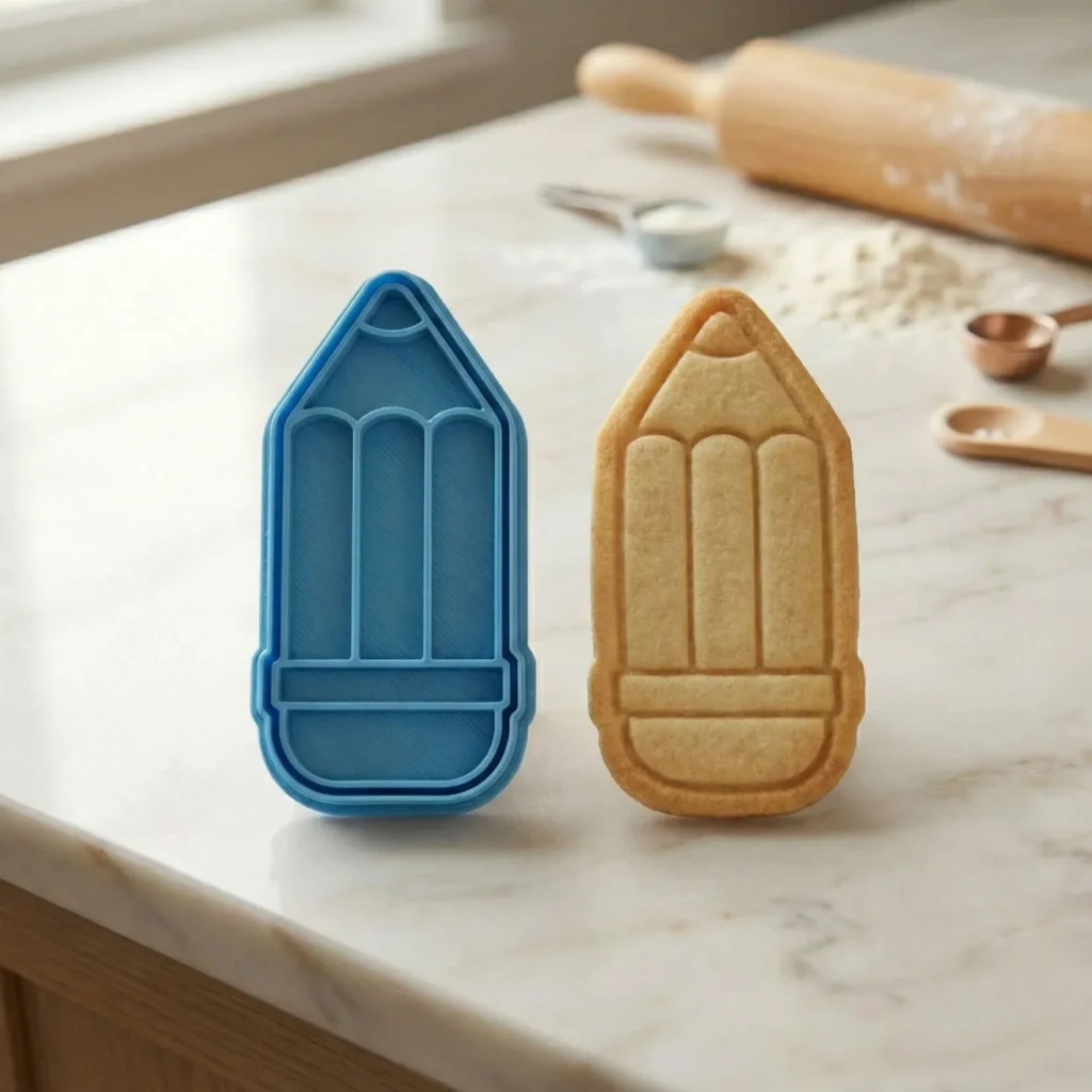 Kit Cortador + Carimbo com pegador traseiro para facilitar o uso. Produzido em PLA biodegradável com acabamento premium para cortes precisos. Perfeito para biscoitos, pasta americana, massinha e artesanato.
