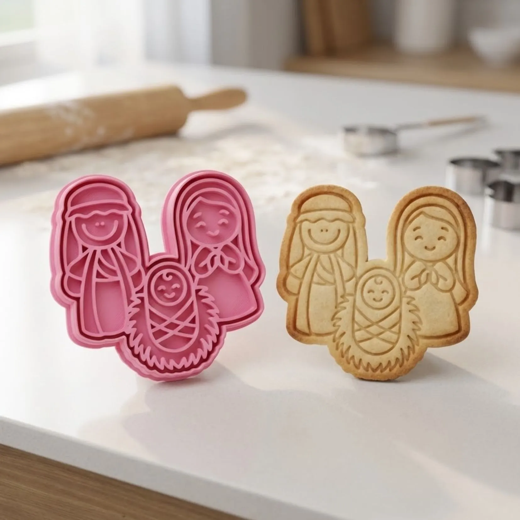 Kit Cortador + Carimbo com pegador traseiro para facilitar o uso. Produzido em PLA biodegradável com acabamento premium para cortes precisos. Perfeito para biscoitos, pasta americana, massinha e artesanato.