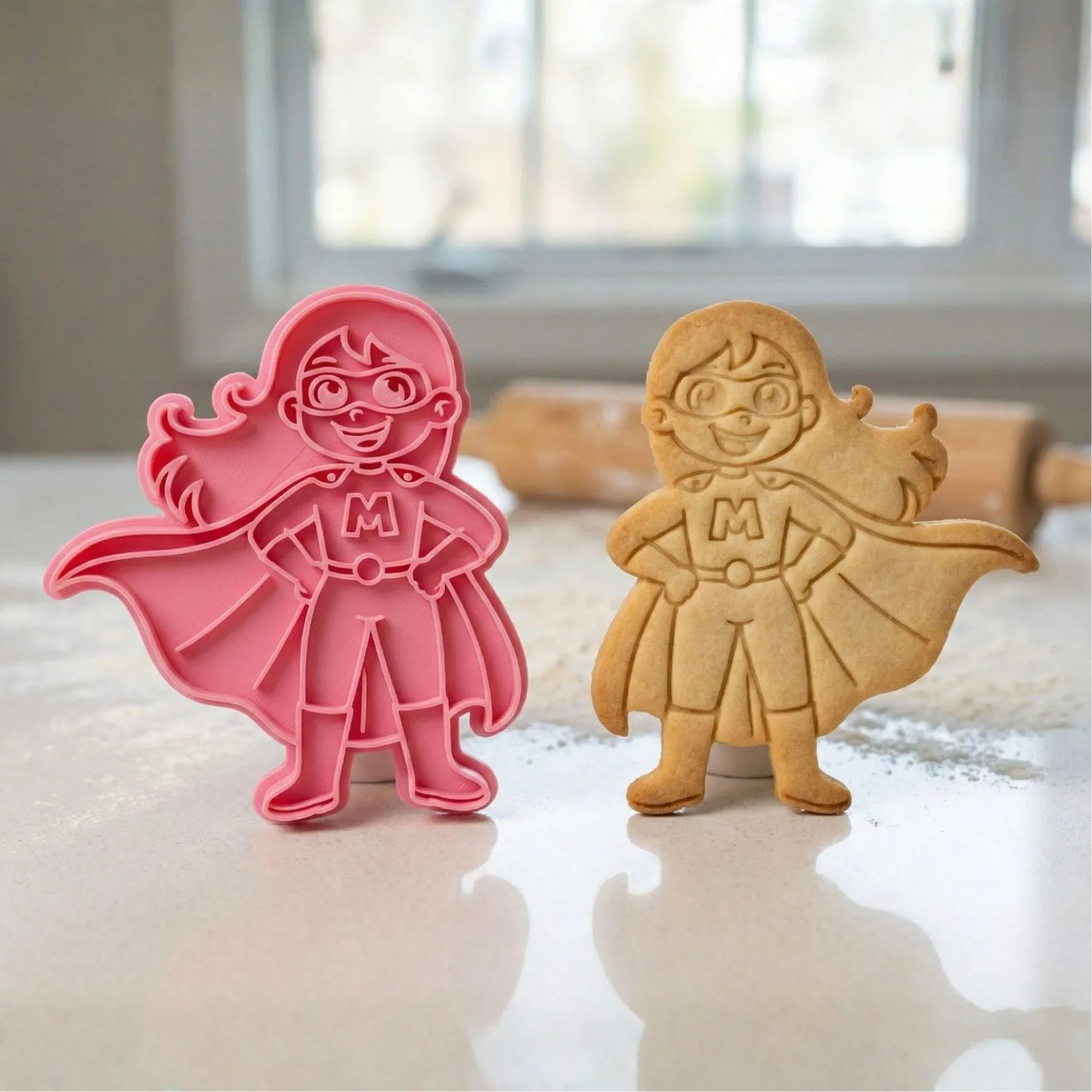 Kit Cortador + Carimbo com pegador traseiro para facilitar o uso. Produzido em PLA biodegradável com acabamento premium para cortes precisos. Perfeito para biscoitos, pasta americana, massinha e artesanato.